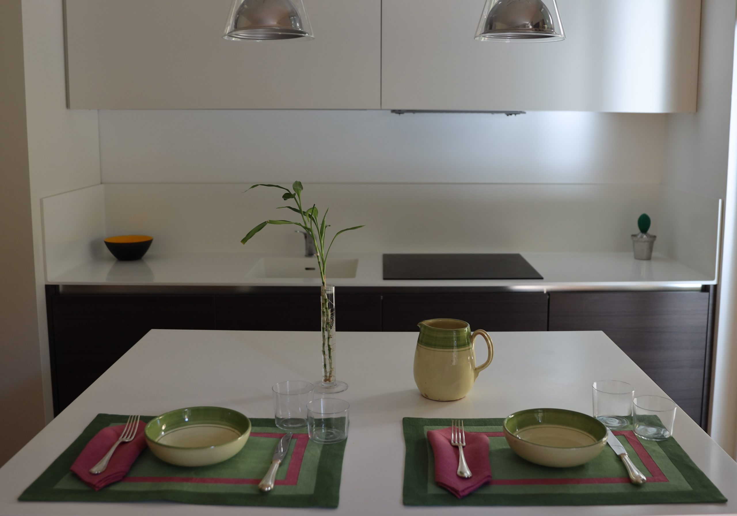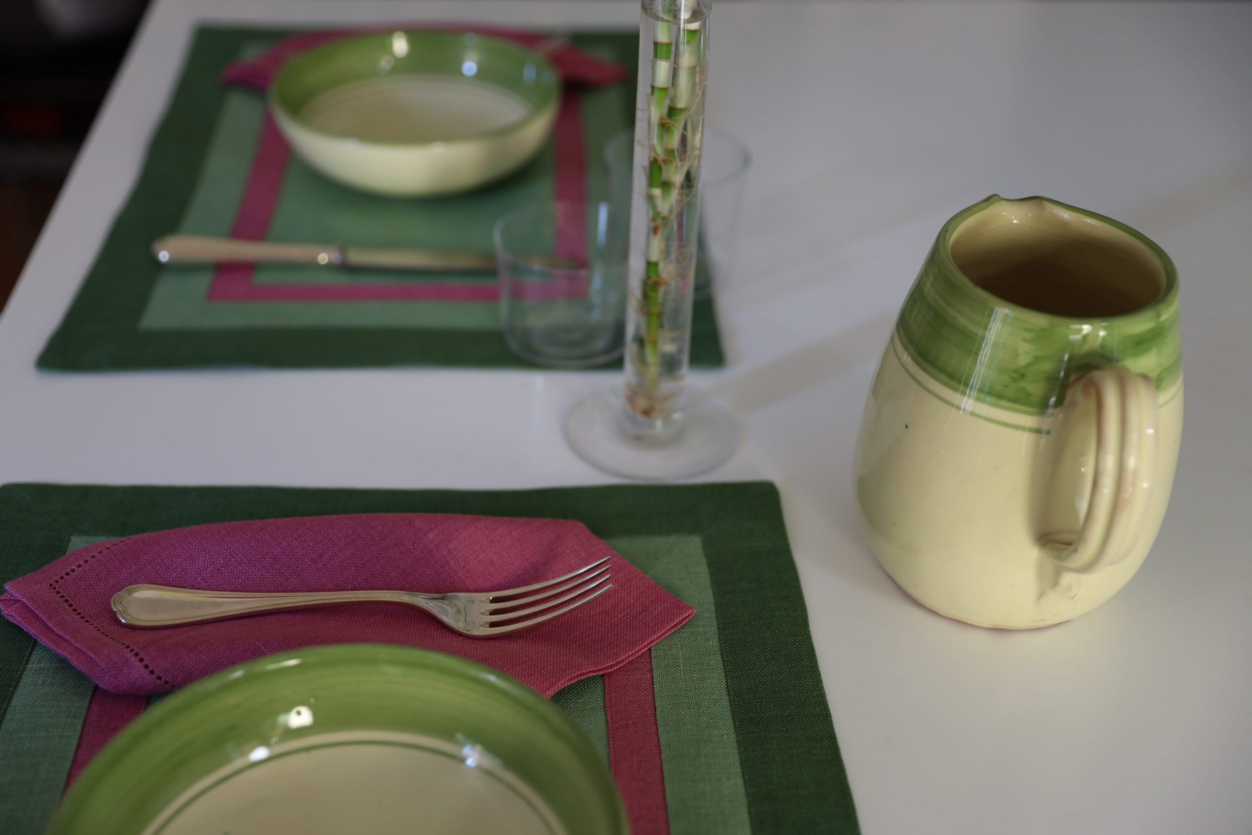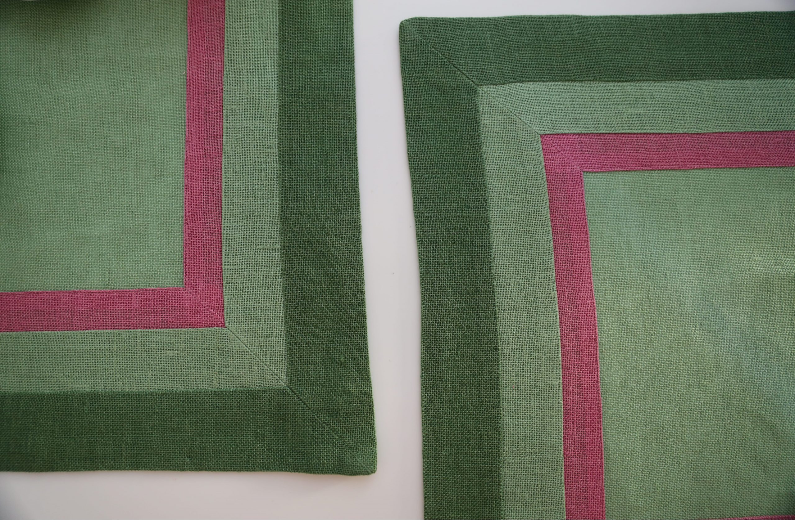 Americano in lino con doppio bordo in contrasto, dimensioni 35×50 cm. Tovagliolo à jour, dimensioni 45×45 cm.