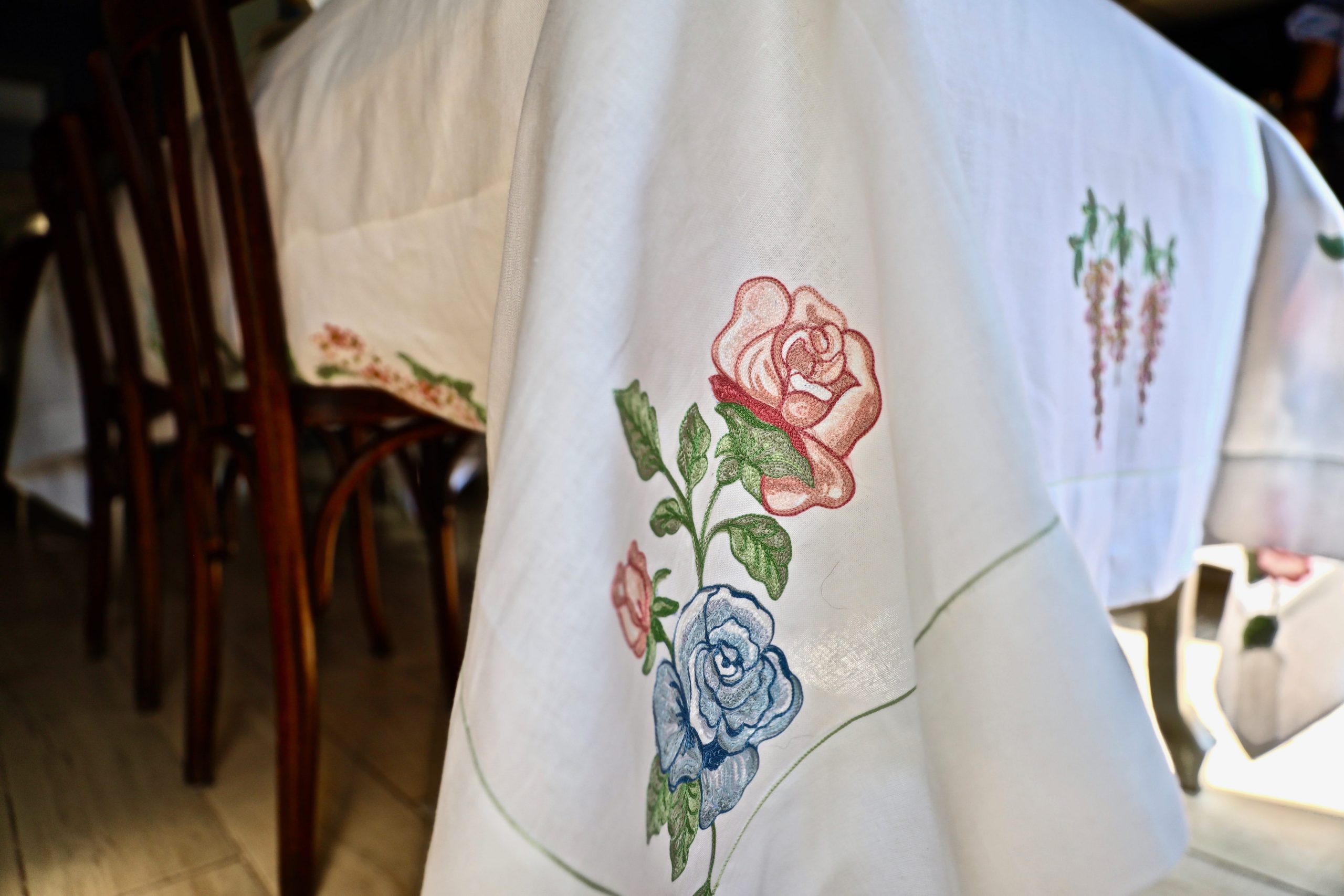 Tovaglia in lino a trama spessa ricamata a punto catenella.
